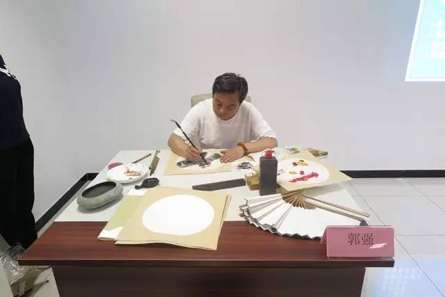 沐心老师以精湛的书法功底,为读者们书写了“缘”,“和为贵”等带有深厚哲学意蕴的扇面,郭强老师点墨挥毫,创作了一幅幅美好的花鸟、山水扇面图。