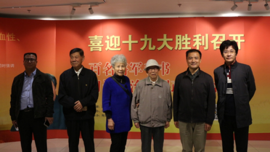 为迎接党的十九大胜利召开,10月10日上午,由北京市海淀区文化委员会、中华爱国教育联盟联合主办,海淀北部文化中心文化馆、北京新北湾文化交流中心承办的“百名将军手书习近平治国理政语书法展”开幕式在海淀北部文化中心一层共享大厅盛大举办。开幕式由解放军军事科学院政治部原主任刘全喜将军主持。中央军委政治工作部老干部学院原院长张和辉将军、国防科工委原副主任张学东将军、海淀区文化委员会工会孙敖度主席出席了开幕式并致词。出席开幕式的嘉宾还有开国元勋朱德元帅儿媳、老八路军赵力平女士,解放军总检察院原副院长、老八路军边文怀将军,解放军信息学院原政委赵友胜将军,南京陆军指挥学院原副院长杨金池将军,总政治部纪检部原部长陈为松将军等。海淀区驻区学校北京中法实验学校师生代表、和平小学师生代表及海淀消防支队杨庄供水中队官兵代表、驻区企业代表、海淀区书法骨干代表等各界人士参加了开幕式。