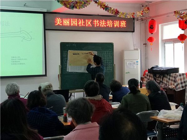上午九点半,第一期书法课在美丽园社区活动大厅正式开始,老师们从书法简史讲起,阐述了书法与养生的关系,用投影为大家展示名家书法作品欣赏。