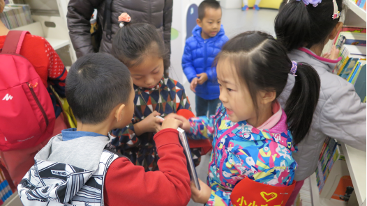 听完讲解后,爸爸妈妈们为孩子们戴上了志愿者袖章,咱们小朋友正式做起了小小志愿者,帮助图书馆的叔叔阿姨们整理少儿阅读区的凌乱书籍。
