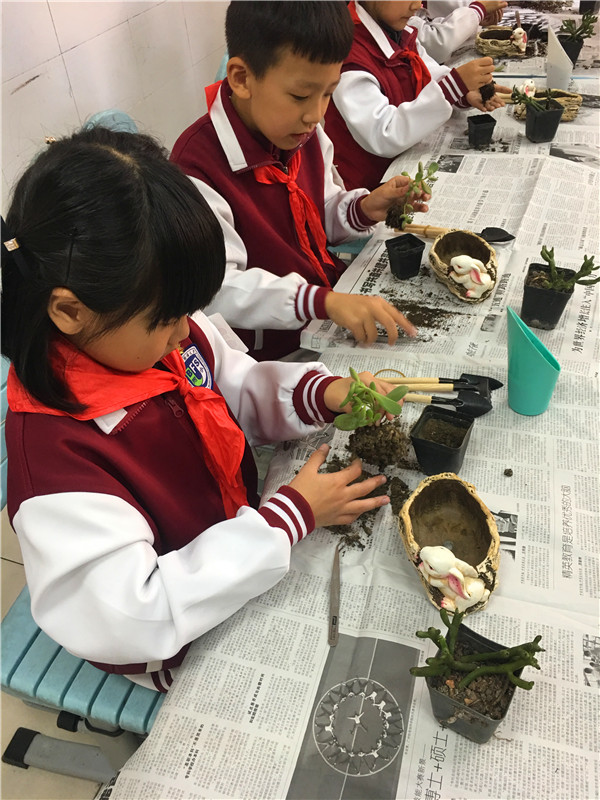 11月2日,活动邀请相关专业老师给北外附小的小朋友们讲解多肉植物的生活习性和组盆技巧。每个小朋友亲自动手,组盆训练栽种了多肉植物。这个过程让小朋友们真正了解到多肉植物的特点和组盆过程中的注意事项。他们动手动脑相结合,不但体会了种植的难易程度,还在种植活动中积极动脑筋,提出了很多有趣的问题,老师都给予了耐心解答。