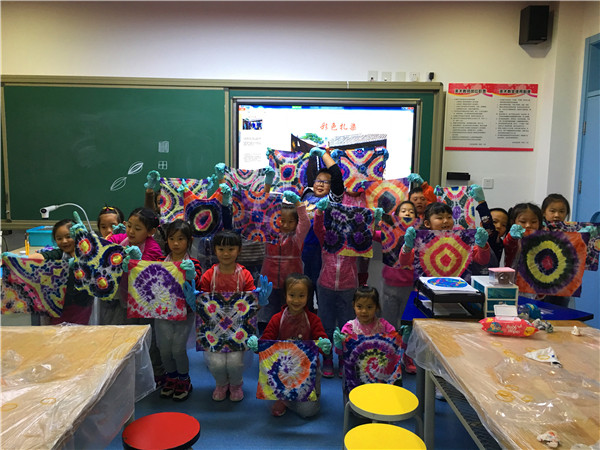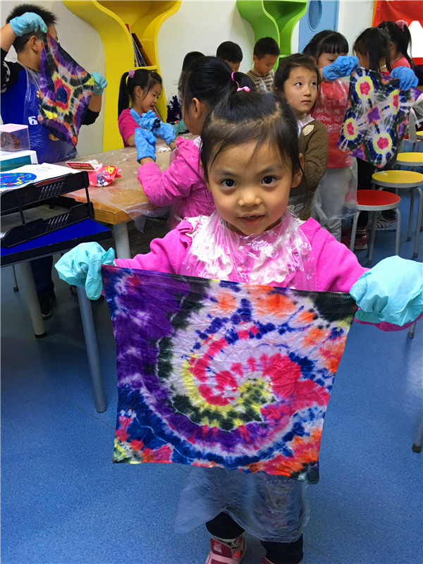 在北京实验学校举办的是扎染专题活动,活动聘请相关专业老师教孩子们认识什么是扎染,并给大家介绍传统的扎染工艺。通过让小朋友自己动手操作,让他们进一步了解和认识扎染的独特魅力。活动最明显的成果是每个小朋友都尝试染出了自己与众不同的作品。