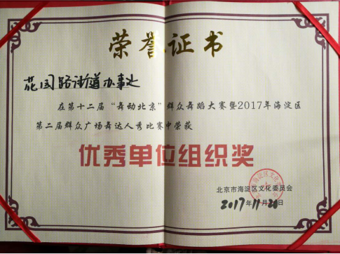 经过两天的初赛11月20日花园路街道金色阳光舞蹈队进入决赛并获得了“银奖”好成绩,街道荣获了“优秀单位组织奖”证书。近两年,通过海淀区创建公共文化服务体系示范区工作的开展,海淀区文委及花园路街道对公共文化工作加大支持力度,鼓励开展群众文化活动,社区居民们参与热情高涨,舞蹈编排有了创新,她们用舞姿跳出了中老年人的自信和快乐,舞出了属于她们的时尚与风采。