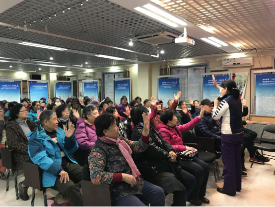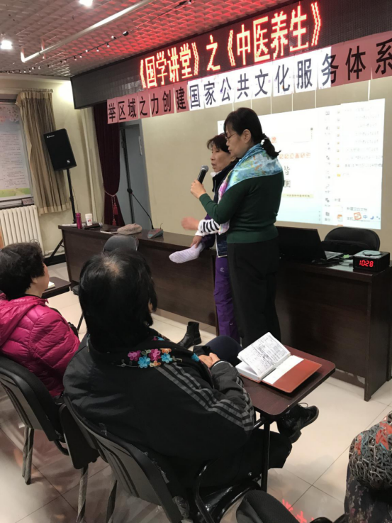 老师重点讲解中医养生的基本知识和整体系统性,其主要目的是提前预防疾病,治未病。例如人的身体从晚二十三至早七点为排毒时间,这个时间段应该休息,其次平时饮食要以清淡、易消化、易吸收为主,不要吃刺激性食物。其中有几个比较重要的保健穴位,老师先带领大家认识这几个穴位:涌泉穴、劳宫穴等。然后给大家讲解如何进行自我按摩,自我治疗。并解答很多老年居民的常见小病,如失眠、腰酸、腿痛的等等。老师热情的进行现场演示,同时邀请大家来一起做保健操,动作非常简单易学。伴随着优美的音乐,整套保健操练下来很多居民都表示微微出汗,既达到运动效果又不剧烈,适合老年居民。很多居民都表示要在家里继续练习,于是老师便把自己的练习心得分享给大家,练习音乐无偿发送给有需求的居民。
