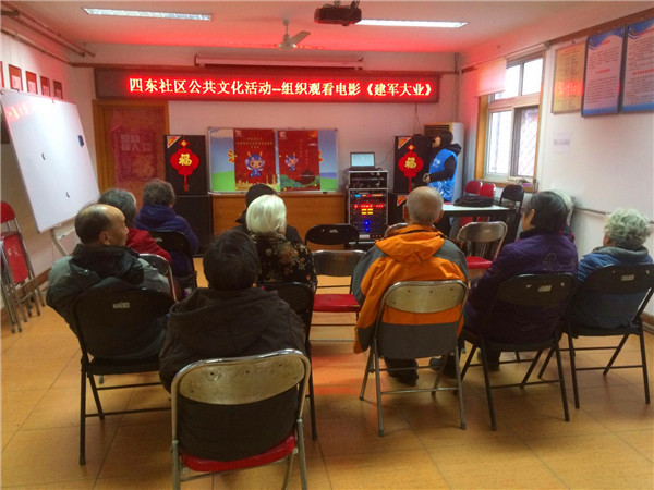 为纪念中国人民解放军建军90周年,缅怀革命先烈,传承革命精神,深入开展红色教育,引导居民们认真学习弘扬革命先辈对党绝对忠诚的崇高品质、坚定不移的理想信念、勇于牺牲的革命精神,永定路街道四街坊东社区特于2017年11月24日下午一点三十分在四东活动站组织辖区15位居民集中观看了电影《建军大业》。