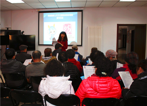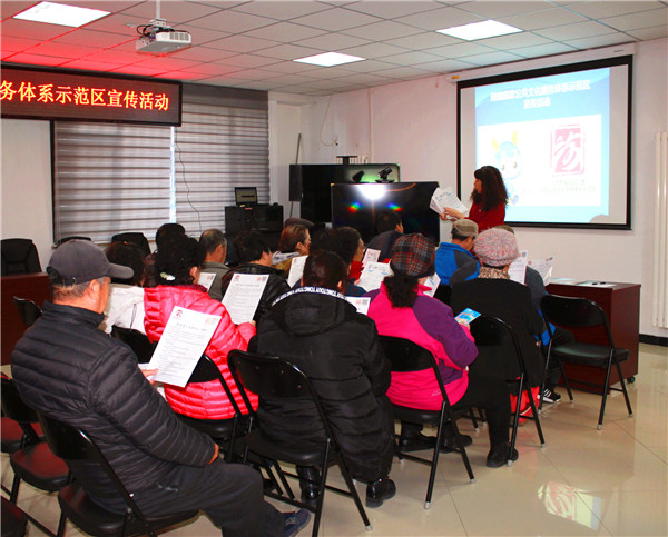为加快推进海淀区创建公共文化服务体系示范区建设,推动文化发展与繁荣,让社区的居民们都能对此不断深入了解,自6月21日起,东升镇八家社区多措并举开展各种形式的宣传工作。11月30日,八家社区再次开展了“举区域之力 创建国家公共文化服务体系示范区”主题宣传活动。