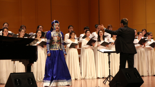 一首蒙古族民歌《牧歌》以无伴奏混声合唱的形式拉开了音乐会的序幕。那相互交织的旋律,纯朴而富有诗意的唱词,勾勒出一幅充满生机和诗情的草原放牧图。接下来的新疆民歌《喀什葛尔女郎》、山西民歌《人说山西好风光》、山东民歌《莲花号子》、河北民歌《回娘家》、陕北民歌《跟你走》等各具特色,展现出中华民族悠久灿烂的历史文化和丰富多彩的人文风情。而作为“国交”合唱团保留曲目《太阳最红,毛主席最亲》、《忆秦娥·娄山关》、《沁园春·雪》等经典曲目的演唱,更是让现场观众意犹未尽。