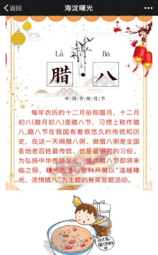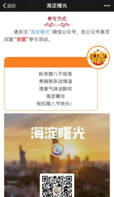 每年农历的十二月俗称腊月,十二月初八(腊月初八)是腊八节,习惯上称作腊八;腊八节在我国有着很悠久的传统和历史,在这一天喝腊八粥、做腊八粥是全国各地老百姓最传统、也是最讲究的习俗。为积极创建第三批国家公共文化服务体系示范区,弘扬中华传统文化,营造喜庆、祥和的节日氛围,值此腊八节即将来临之际,曙光街道开拓思路、创新活动形式,依托“海淀曙光”公共微信号平台开展以“温暖曙光,浓情腊八”为主题的答题抢腊八米活动。
