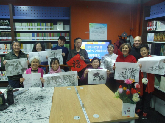 活动接近尾声,大家兴致勃勃的举起自己手中的画作,如兄弟姐妹般亲密无间,兴奋无比的走到一起和优秀的老师合影留念。此起彼伏的欢声笑语回荡在北太平庄街道文化中心的画室中。