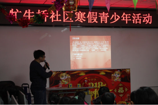 为丰富社区青少年寒假生活,宣扬中华民族传统文化,花园路街道于2018年1月30日下午三点,在牤牛桥社区活动室组织开展寒假青少年活动,社区邀请专业讲师为孩子们讲解中华民族重要的传统节日及日期,使学生了解人们庆祝传统节日的民间传统习俗,培养学生的生活情趣。