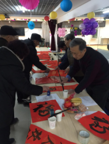 游戏环节结束后,世纪书画院的老师们为大家现场书写福字和春联,居民们手捧喜庆的福字和春联,满面春光,怎一个“美”字了得。