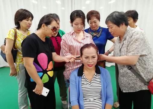老师通过真人示范教学让听课的阿姨们了解到了舞台妆的基础知识和技巧,如何根据个人皮肤特点选择化妆品,保养护肤小技巧等。老师一边化妆,一边结合脸部结构、皮肤特质讲解化妆的步骤、技巧和注意事项。老师耐心讲解,下面学阿姨们积极讨论,欢声笑语充满了整个课堂。