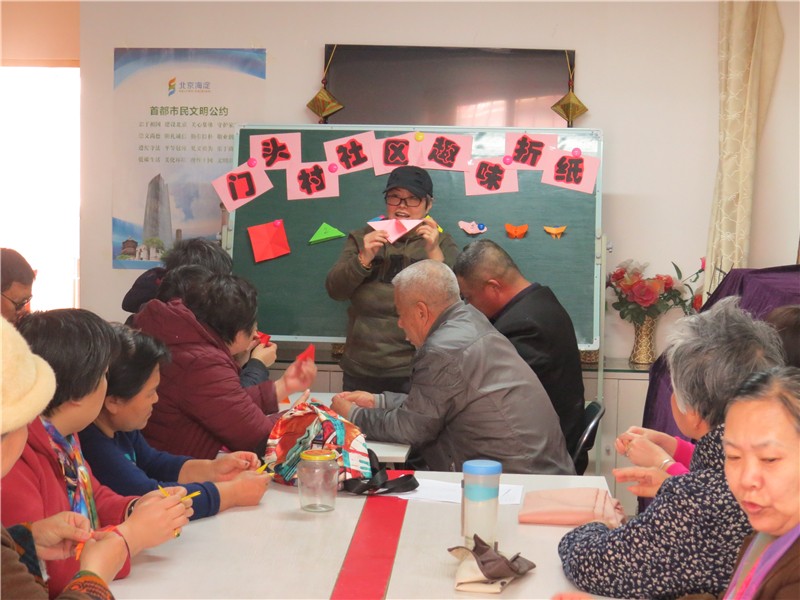 为丰富辖区居民的业余生活,增强辖区老年朋友的动手能力,增进邻里之间的友谊。2月25日下午,门头村社区工作人员给辖区居民们上了一堂生动有趣的手工折纸课。