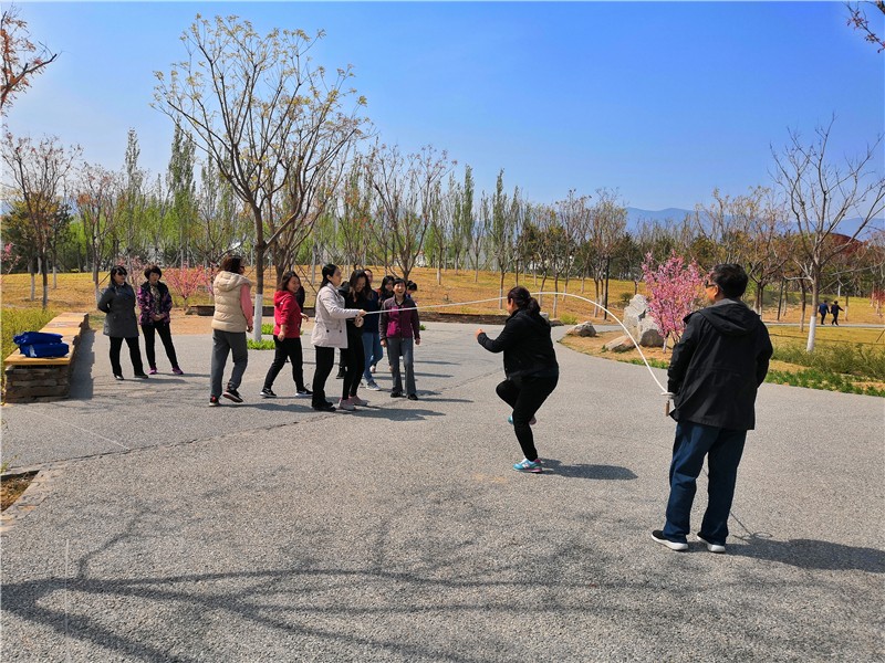 4月12日,香山村组织20位村民到碧云寺公园参加“跳动春天”,团体跳绳友谊赛,依托香山村周边环境,开展户外活动。