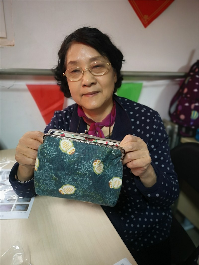 “正反对齐,沿线缝制,走平针哈……”,阿姨们在动手制作过程中谨记老师交待的制作要领。里布和外布联合缝制在一起也是有技巧的,最后是耐心的将口金安装在布包上,这一步好像难倒了所有人,“这个布怎么卡进去?”、“从这个孔进去简单,但还要从这个孔出来就很难了,总是对不上啊”。大家一边探讨手工包的最佳缝制方法,一边相互欣赏着彼此的针线活,一片欢声笑语、其乐融融。经过一个半小时的摸索与努力,大家终于完成了自己心仪的手包。