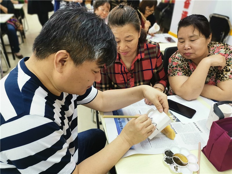 活动邀请了紫砂鉴赏师、手工艺师王孝军老师来讲授本次课程。王老师首先讲解了青花工艺品基础知识:历史沿革,原材料产地及成分,制作工艺,原材料配制,釉料知识,上釉方法,鉴赏。接下来,在工艺师的指导下,居民们开始亲手绘制青花瓷杯。勾勒、描绘,每个人都是专心细致的描画自己的作品,经过2个多小时的创作,一件件清新淡雅的青花水杯诞生在居民的手中。