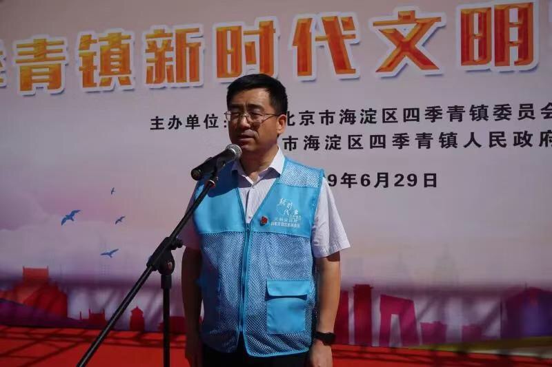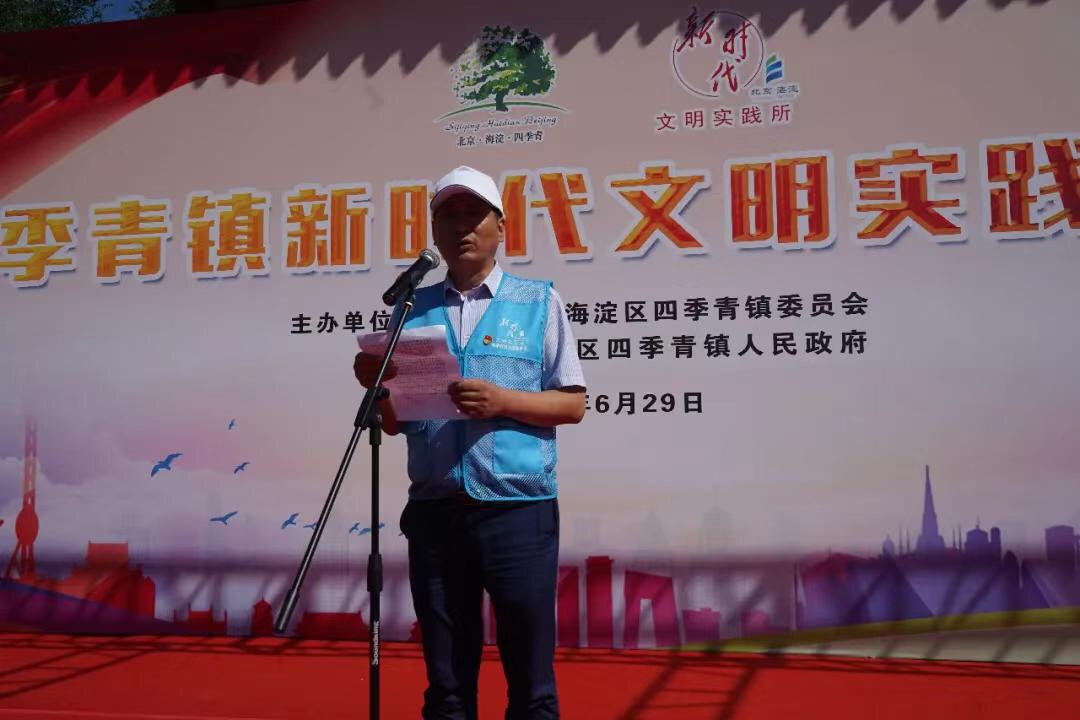 首先,四季青镇党委副书记赵仕伟介绍了四季青镇新时代文明实践所情况,指出了四季青镇新时代文明实践所承担的五项工作任务、四项工作措施及实施步骤。区、镇领导集体为11支志愿服务队代表授旗。志愿者代表现场发布了志愿服务倡议书。