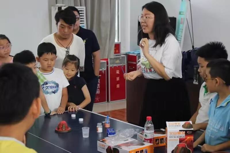 老师用生动活泼的语言一边讲课一边与同学们互动着,小朋友们对这些内容非常感兴趣,每位同学眼睛里都透着求知的渴望。他们与老师的一问一答充满童趣,有的小朋友的奇思妙想逗笑现场的家长,也有的小朋友知识面非常广泛,连老师都大为赞叹。老师带领大家做了火山爆发的模拟实验,大家围成一圈,仔细的观察着,并时不时的发出惊叹的叫声,最终在欢快的热闹的气氛中,结束了第一天的课程。