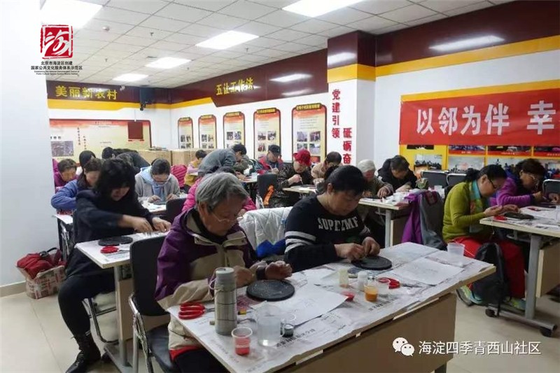 接下来在吴老师的指导下居民们亲自动手体验了掐丝珐琅工艺画的制作,学习了“掐丝”和“点蓝”两个最为关键技术环节。“掐丝”—是用金属丝按照盘子上提前勾描出的图案掐成图案,粘在盘子上。每个居民屏气凝神,小心翼翼的进行粘贴。“点蓝”—是用提前洗好的彩砂混合特制的胶水填补到金属丝勾勒的空隙间,操作过程中用吸管吸走多余的水分,抹平。经过一个上午的操作,大部分居民完成了自己的作品,纷纷感叹制作一个艺术作品的不容易。