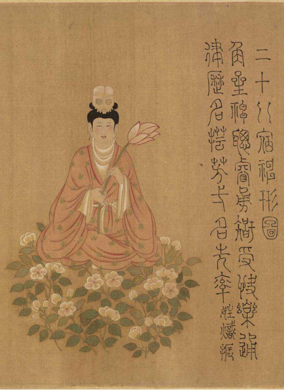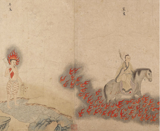 本图绘五星二十八宿神形象。五星即金、木、水、火、土星。二十八宿最初是古人为比较日、月、五星的的运动而选择的二十八个星官,作为观测时的标志。此图绘想象中的星宿形象,现仅存五星和十二宿图。推测此图当为原作之上卷。每星、宿一图,或作女像,或作老人,或作少年,或兽首人身。每图前有篆书说明。卷首题有隶书“奉义郎龙州别驾集贤院待制仍太史梁令瓒”。