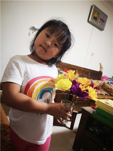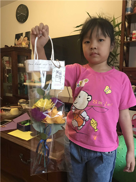 孩子们将花束制作材料包领回去后,利用放学的时间,在家人的帮助下专心的制作,参照视频,一点一点的剪、折,粘,包。很快一件件小花束就陆续的发布了出来。